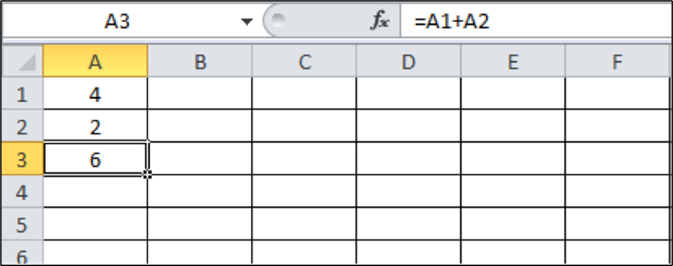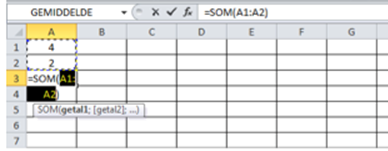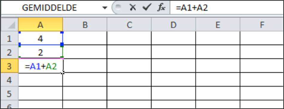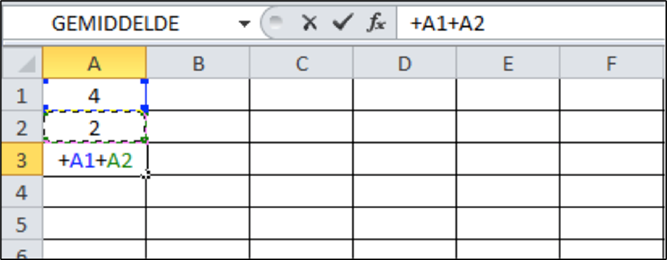 Ga met de muis naar cel A3. Klik met de muis links. De cel is actief. Typ vervolgens “+” en klik daarna met de muis op cel A1. Typ nu “+” en ga met de muis naar cel A2. In cel A3 staat nu de formule: +A1+A2